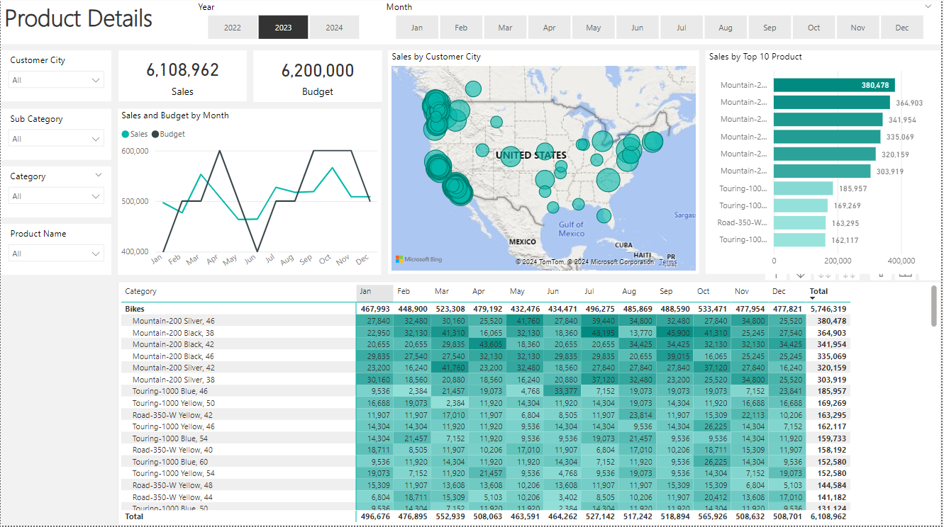 Interactive Filters: Users can filter data by year, month, customer city, subcategory, category, and product name.